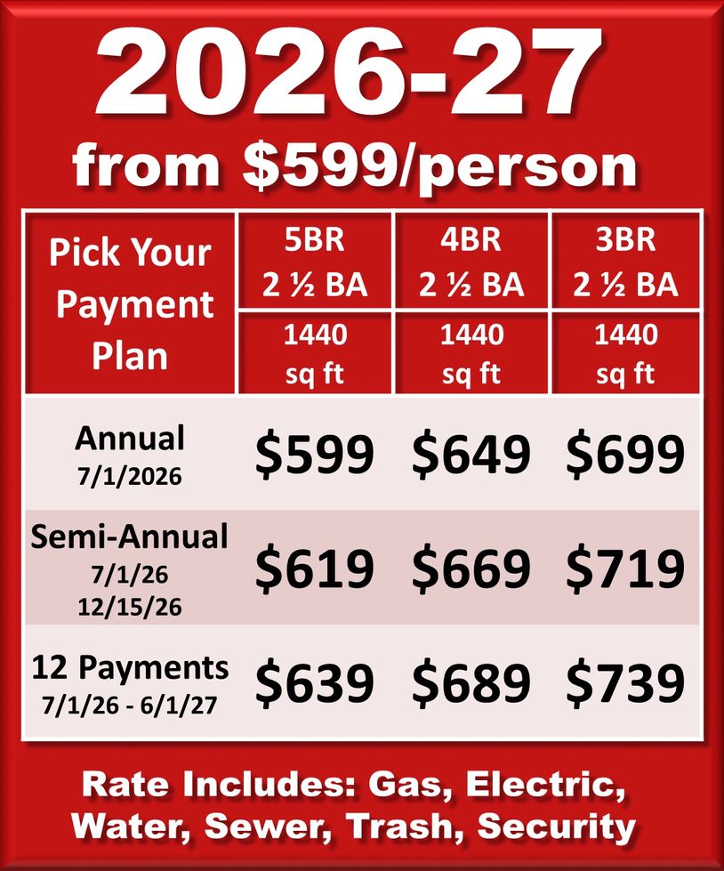 To reserve a bedroom an Online Leasing/Redecorating Fee and Security Deposit is payable totaling $500 per person. Security Deposit is refundable at the end of the lease term.